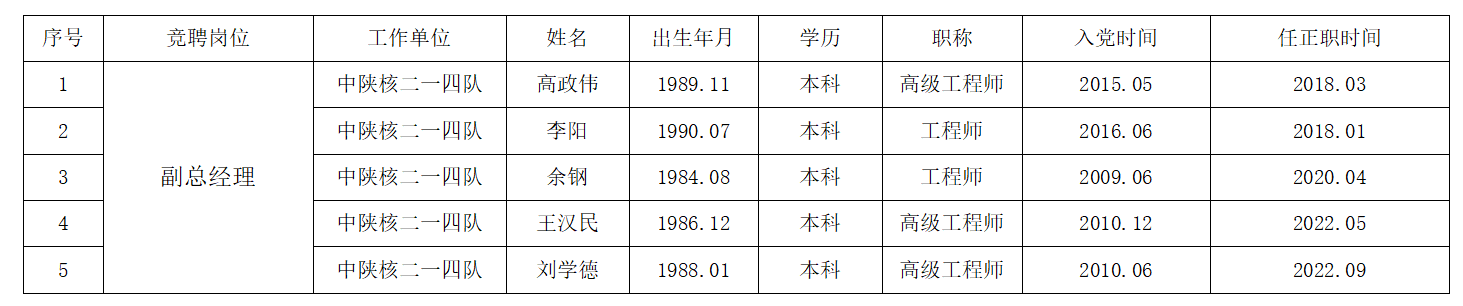 根据《中陕核工业集团二一四大队有限公司副总经理岗位市场化选聘工作的实施方案》有关要求,现对资格审查通过的报名人员予以公示: