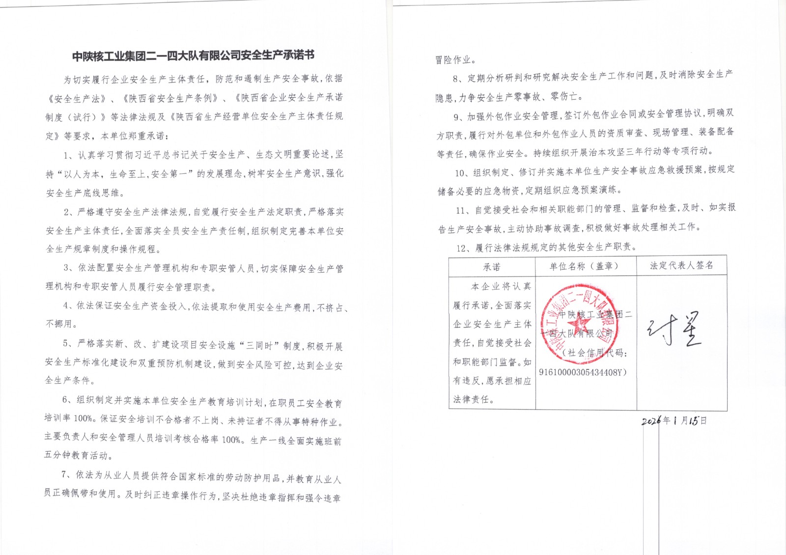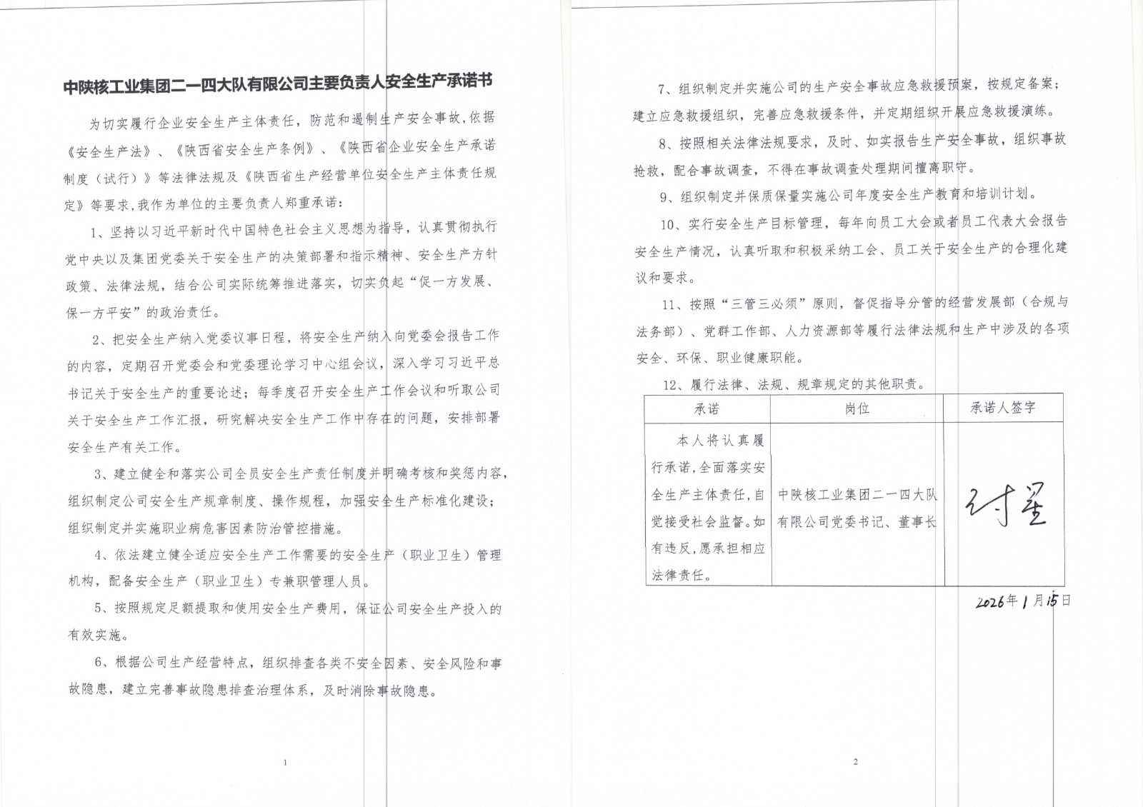 中陕核工业集团二一四大队有限公司安全生产承诺书
