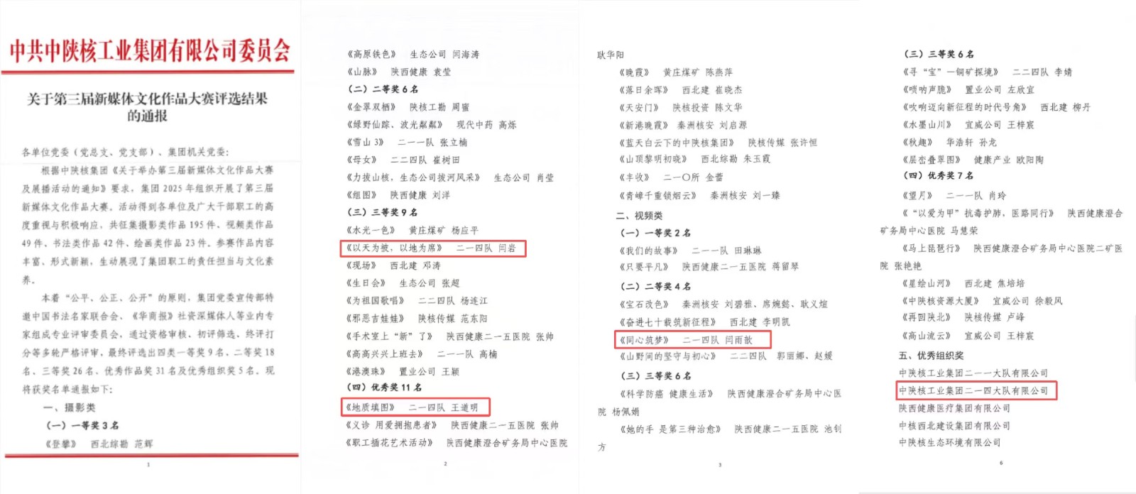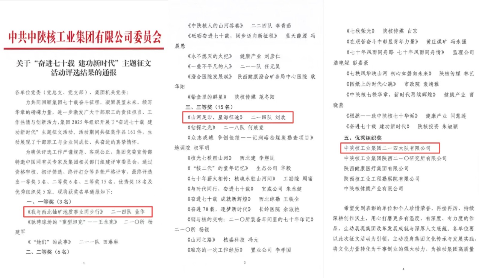 近日,中陕核二一四队在集团第三届新媒体文化作品大赛与“奋进七十载建功新时代”主题征文比赛中斩获颇丰,共荣获一等奖1项、二等奖1项、三等奖2项、优秀奖1项,同时凭借组织工作成效显著,斩获两项“优秀组织奖”。