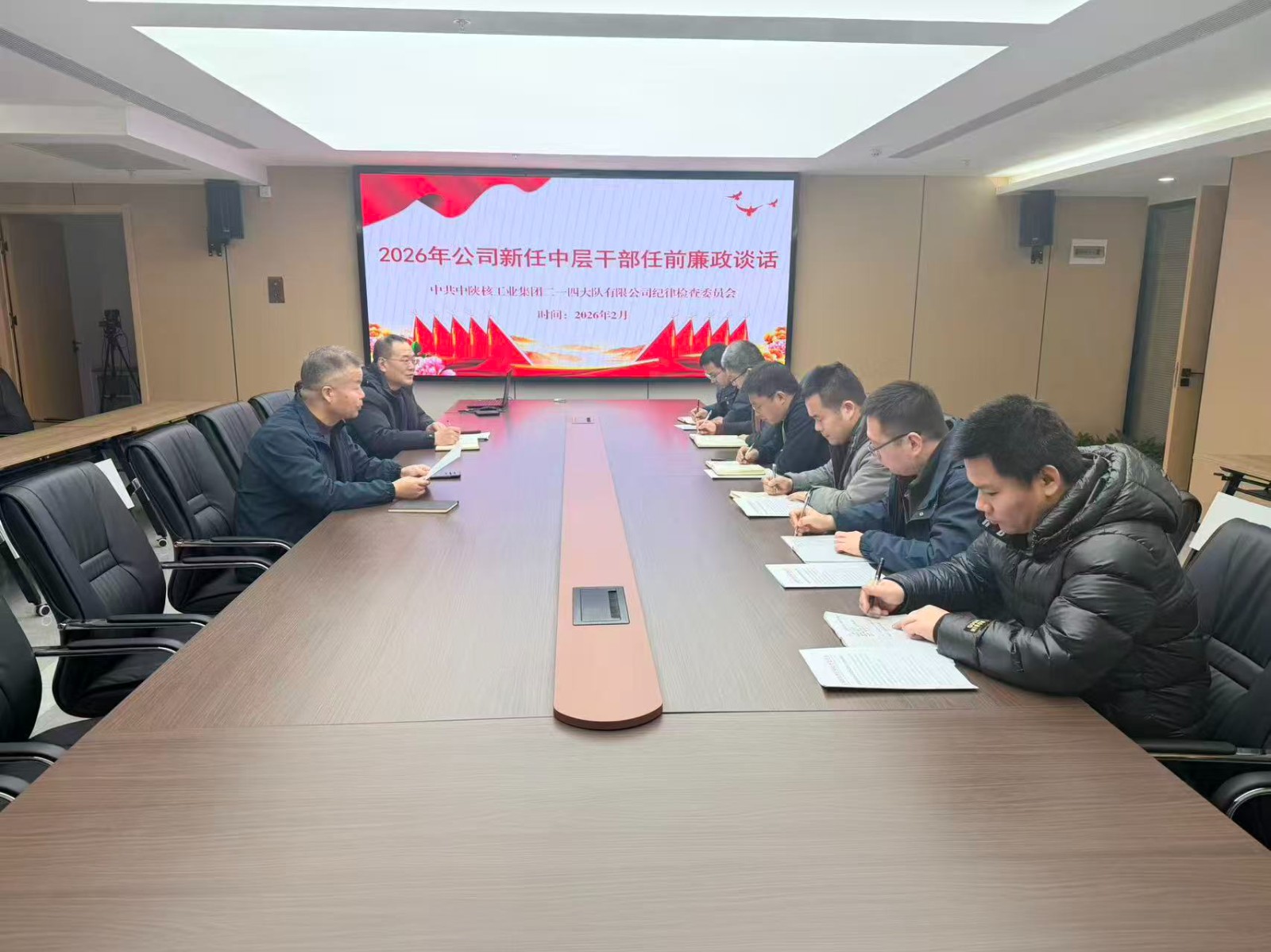 2月10日,为进一步加强队伍建设,强化责任担当与廉洁从业意识,促进新任职干部廉洁自律、正确履职,充分发挥教育在先、预防在前的作用,中陕核二一四队纪委书记杨昭与新提任6位中层干部开展任前廉政谈话。